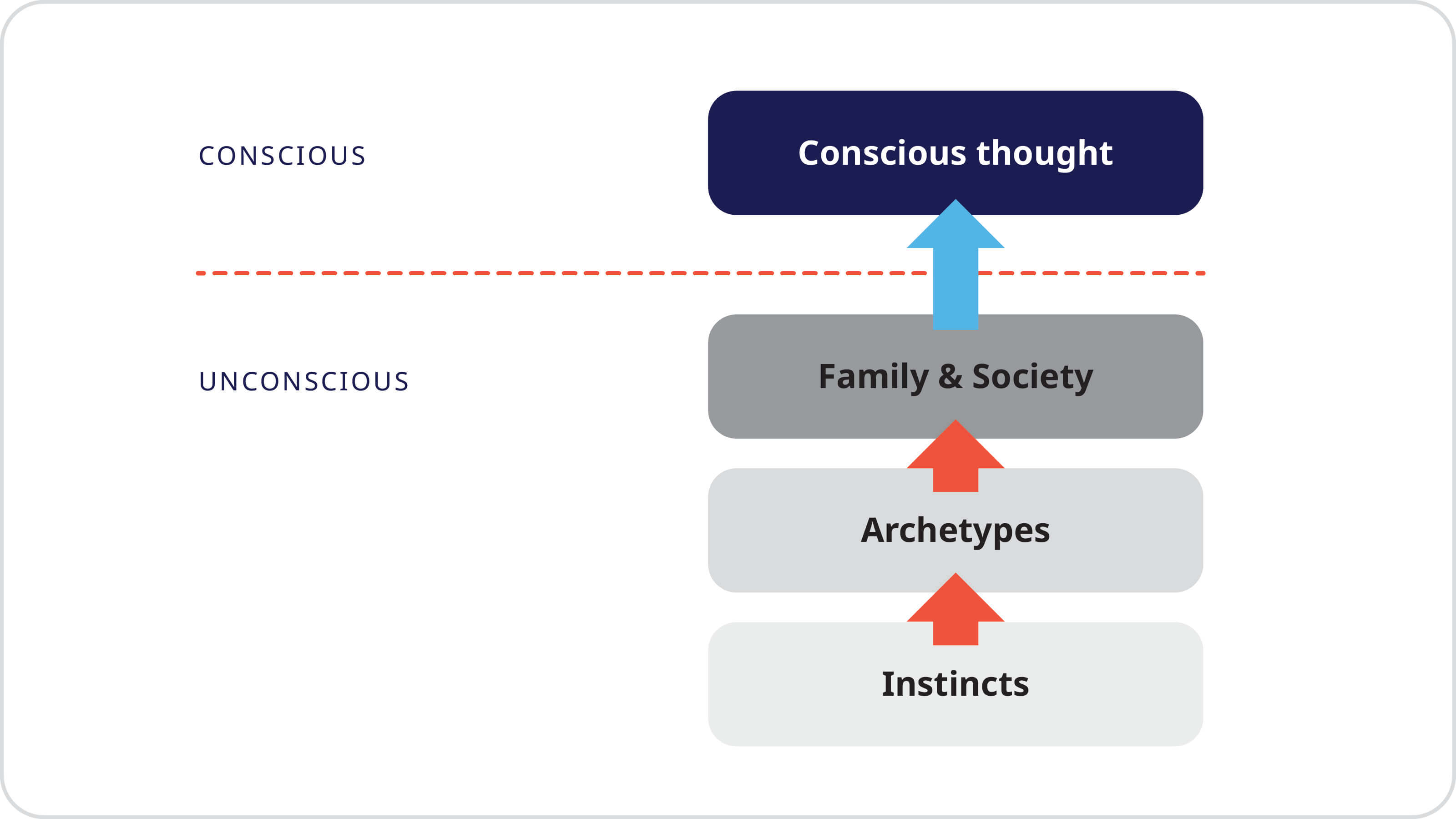 Archetypes are inherited patterns of thinking and feeling that live in the subconscious and are closely connected to our instincts. When an instinct arises, it can trigger archetypal thoughts or attitudes, often without our awareness. This response is then shaped by the conditioning we receive through our upbringing, both from family and society. Only afterward does conscious thought emerge, influenced by these forces.